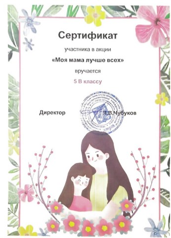 Сертификат за участие в акции "Моя мама лучше всех", 5В |