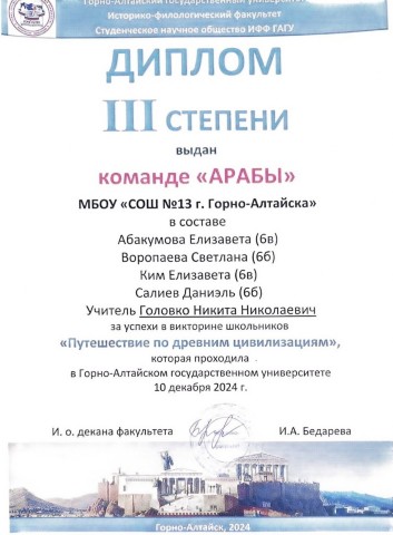 2024 Диплом 3 степени за успехи в викторине школьников "Путешествие по древним цивилизациям" |