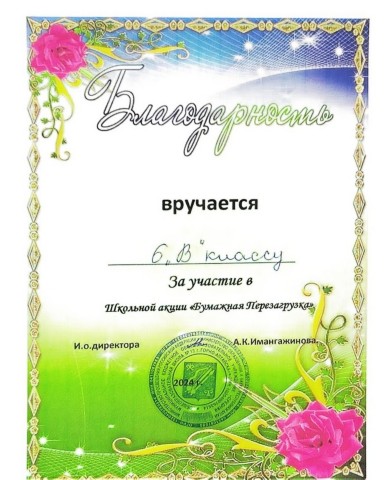 2024 Благодарность за участие в акции "Бумажная перезагрузка", 6В |