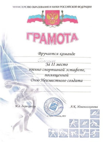 2024 Грамота за 2 место в военно-спортивной эстафете, посвященной дню неизвестного солдата |